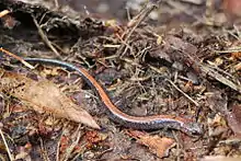 The red-backed salamander is a small terrestrial salamander, 5.7–10.0 cm (2.2–3.9 in) in total length (including tail), which usually lives in forested areas under rocks, logs, bark, and other debris.[3] It is one of the most numerous salamanders throughout its range.[3] Red-backed salamanders are mostly insectivorous, but prey on a wide assortment of other small invertebrates including isopods, millipedes, centipedes, pseudoscorpions, harvestmen, spiders, and gastropods.[8] On one occasion an individual was found to have cannibalized a P. cinereus embryo.[8] Predators of the red-backed salamander are many and varied, and include small mammals, snakes, ground-foraging birds, and larger salamanders.[9]