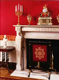 Du Pont suggested the room be made over using Duncan Phyfe furniture, while Gerald Shea[lower-alpha 3] of the Committee on Fine Arts felt that American Empire style furniture would be better.[11] Other advisors wanted furniture in the "French antique" style of Charles-Honoré Lannuier.[12] Since no single individual was in charge of the renovation effort, at first confusion reigned. The issue was largely decided after a potential patron turned down a request to donate a suite of American Empire furniture, and Kennedy convinced du Pont that a mix of French Empire and American Empire was appropriate.[13]