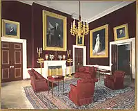 Boudin oversaw the installation of art in the Red Room as well. Boudin preferred a French design aesthetic,[17] which emphasized covering as much wall space as possible with paintings. This scheme was implemented early in 1961, but in early 1962 (after the walls were recovered in silk) Boudin altered this scheme. He now created two rows of paintings, one at eye-level and one above the top of the door frames. This mimicked the look of an art gallery, and was used in many French country manor-houses.[7]