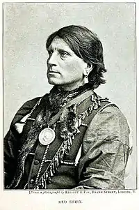 Red Shirt (Oglala Lakota: Ógle Šá in Standard Lakota Orthography) (a/k/a "Ogilasa" and "Joseph Red Shirt") (1847-January 4, 1925) was an Oglala Lakota chief, warrior and statesman. Red Shirt is notable in American history as a U.S. Army Native Scout and a progressive Oglala Lakota leader who promoted friendly associations with whites and education for his people. Red Shirt opposed Crazy Horse during the Great Sioux War of 1876-1877 and the Ghost Dance Movement of 1890, and was a Lakota delegate to Washington in 1880. Red Shirt was one of the first Wild Westers with Buffalo Bill's Wild West and a supporter of the Carlisle Native Industrial School. Red Shirt became an international celebrity Wild Westing with Buffalo Bill's Wild West and his 1887 appearance in England captured the attention of Europeans and presented a progressive image of Native Americans.
