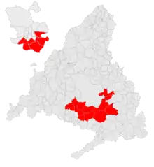 The expression red belt is used to designate in the Community of Madrid, since the return to democracy in the last decades of the 20th century, the set of cities located in the southern part of the metropolitan area of the city of Madrid, characterized by their high population of workers or working class and because of their long history with mayors of the Spanish Socialist Workers Party or other left parties and coalitions such as the Communist Party of Spain or the United Left, representing a total of 21% of the population residing in the Community of Madrid, with six out of the ten most populated municipalities of the region belonging to the red belt.[1][2][3][4] The name is also used to talk about the southern districts of the city of Madrid.[5]