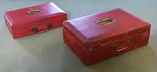 Red boxes, or sometimes ministerial boxes, are a type of despatch box[1] produced by Barrow Hepburn & Gale and are used by ministers in the British government and the British monarch to carry government documents. Similar in appearance to a briefcase, they are primarily used to hold and transport official ministerial papers. Red boxes are one modern form of despatch boxes, which have been in government use for centuries. Despatch boxes of a very different design remain in use in the chamber of the lower house of the British and Australian parliaments. Those boxes hold religious books for swearing-in new members of the chamber, but are also used as lecterns by front bench members.