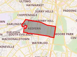 Redfern is an inner-city suburb of Sydney located 3 kilometres south of the Sydney central business district and is part of the local government area of the City of Sydney. Strawberry Hills is a locality on the border with Surry Hills. The area experienced the process of gentrification[2] and is subject to extensive redevelopment plans by the state government, to increase the population and reduce the concentration of poverty in the suburb and neighbouring Waterloo (see Redfern-Eveleigh-Darlington).