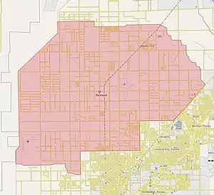 A smaller-sized community centered around SW 187th Avenue (Redland Road) and SW 264th Street (Bauer Drive) was briefly incorporated as "Redland" in 1910 and then dissolved.[7] Efforts in the 1920s to reincorporate a "town of Redland"—a six-square mile area with proposed borders of SW 280th Street (Waldin Drive) on the south, SW 197th Avenue (Richard Road) on the west, SW 232nd Street (Silver Palm Drive) on the north, and S.W. 177th Avenue (Krome Avenue) on the east—failed when residents could not agree on the precise town limits.[13] Later in the 20th century, people simply began referring informally to the entire agricultural area stretching northwest from (and outside of) the now well-developed Florida City, Homestead, and US 1 corridor as "the Redlands."[7] Today, there is little consistency in usage.[7] While a few residents maintain "the Redlands" is used only by those from outside the area, "Redland," "the Redlands," and "the Redland" are generally used interchangeably, with "Redland" being the more formal usage.