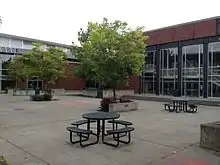 The Redmond High School campus is centered in one large building containing academic classrooms, a student cafeteria, a central courtyard, three gymnasiums, and a performing arts center. The B Wing extension, added in 2012, includes several additional classrooms. Several portable classrooms are also set up in close proximity to the main building.
