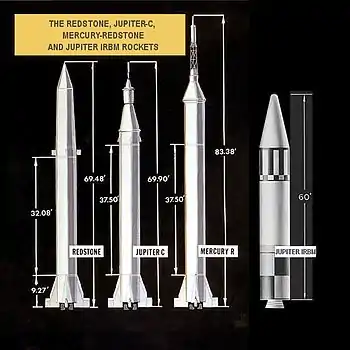 The Redstone family of rockets consisted of a number of American ballistic missiles, sounding rockets and expendable launch vehicles operational during the 1950s and 1960s. The first member of the Redstone family was the PGM-11 Redstone missile, from which all subsequent variations of the Redstone were derived. The Juno 1 version of the Redstone launched Explorer 1, the first U.S. orbital satellite in 1958 and the Mercury-Redstone variation carried the first two U.S. astronauts into space in 1961. The rocket was named for the Redstone Arsenal in Huntsville, Alabama where it was developed.[1]