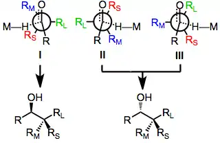 The origin of diastereoselectivity in reductions of chiral ketones has been extensively analyzed and modeled.[14][15] According to a model advanced by Felkin,[16] diastereoselectivity is controlled by the relative energy of the three transition states I, II, and III. Transition state I is favored in the absence of polar groups on the α carbon, and stereoselectivity increases as the size of the achiral ketone substituent (R) increases. Transition state III is favored for reductions of alkyl ketones in which RM is an electron-withdrawing group, because the nucleophile and electron-withdrawing substituent prefer to be as far away from one another as possible.