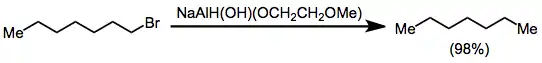 Functional groups containing heteroatoms other than oxygen may also be reduced to the corresponding hydrocarbons in the presence of an alkoxyaluminium hydride reagent. Primary alkyl halides undergo reduction to the corresponding alkanes in the presence of NaAlH(OH)(OCH2CH2OCH3)2. Secondary halides are less reactive, but afford alkanes in reasonable yield.[28]