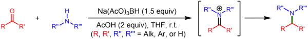Reductive amination (also known as reductive alkylation) is a form of amination that involves the conversion of a carbonyl group to an amine via an intermediate imine. The carbonyl group is most commonly a ketone or an aldehyde. It is considered the most important way to make amines, and a majority of amines made in the pharmaceutical industry are made this way.[1][2]