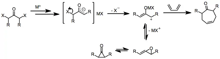 Initial reduction of α,α'-dihalo ketones leads to metal enolate intermediates. Loss of the remaining halide generates 2-oxyallyl metal complexes, which undergo [4+3] and [3+2] cycloaddition reactions in the presence of dienes or olefins.[1] Isomerization of 2-oxyallyl metal complexes to cyclopropanone and allene oxide forms is rapid and reversible; increasing the covalent character of the oxygen–metal bond favors the 2-oxyallyl isomer.[10]