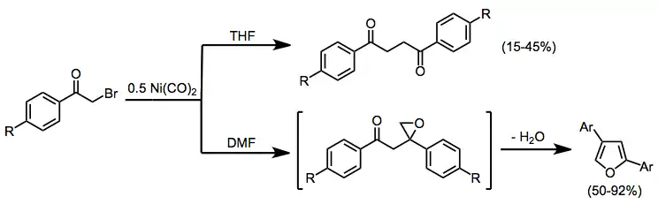 Reductive dimerization may result from the combination of two intermediate α-acyl radicals or nucleophilic attack of a metal enolate on unreacted halo ketone. Although complex reaction mixtures often result,[6] selective dimerization is possible in some cases. In the example below, the product distribution is solvent dependent[16]