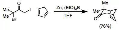 The 2-oxyallyl metal intermediates generated during reductions of α,α'-dihalo ketones with iron(0) complexes participate in [4+3] and [3+2] cycloaddition reactions to form cycloheptenones and cyclopentanones, respectively. During [3+2] cycloaddition reactions, the substituent on the alkene may eliminate to provide cyclopentenones from alkenes in one pot.[20]