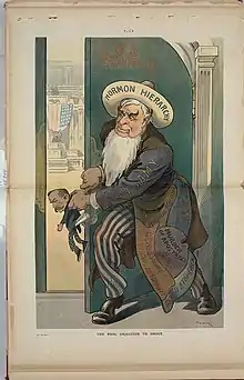 The four-year Senate proceeding created a 3,500-page record of testimony by 100 witnesses on every peculiarity of Mormonism, especially its polygamous family structure, ritual worship practices, "secret oaths," open canon, economic communalism, and theocratic politics. The public participated actively in the proceedings. In the Capitol, spectators lined the halls, waiting for limited seats in the committee room, and filled the galleries to hear floor debates. For those who could not see for themselves, journalists and cartoonists depicted each day's admission and outrage. At the height of the hearing, some senators were receiving a thousand letters a day from angry constituents. What remains of these public petitions fills 11 feet of shelf space, the largest such collection in the National Archives.[5]
