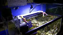 The primary biological filtration for reef aquariums usually comes from the use of live rock which come from various tropical zones around existing reefs, or more recently aquacultured rock from Florida.[2] Some reefkeepers also use what is called deep sand beds (DSB).[3] These are often employed to augment the biological filtration by aiding in the reduction of nitrate, a waste product in an incomplete nitrogen cycle. Deep sand bed opponents may prefer a "bare bottom" or "suspended reef" which allows for easier removal of nitrate-generating accumulated detritus. This biological filtration is usually supplemented by protein skimmers. Protein skimmers use the foam fractionation process wherein air is introduced into a water stream creating microbubbles. Organic waste adheres to the surface of these microbubbles and is removed as it overflows at the reactor surface into a removable cup. This group of elements used in conjunction is characteristic of the Berlin Method, named for the city in which it was first devised.