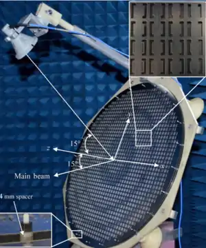 A reflectarray antenna (or just reflectarray) consists of an array of unit cells, illuminated by a feeding antenna (source of electromagnetic waves).[1][2] The feeding antenna is usually a horn. The unit cells are usually backed by a ground plane, and the incident wave reflects off them towards the direction of the beam. A phase distribution of concentric rings is applied to focus the wavefronts from the feeding antenna into a plane wave (to account for the varying path lengths from the feeding antenna to each unit cell). A progressive phase shift can be applied to the unit cells to steer the beam direction.[3] It is common to offset the feeding antenna to prevent blockage of the beam.[4] In this case, the phase distribution on the reflectarray surface needs to be altered. A reflectarray focuses a beam in a similar way to a parabolic reflector (dish), but with a much thinner form factor.