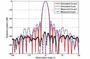 It is important to analyse the reflection magnitude and the reflection phase across the frequency bandwidth of operation. When designing a reflectarray, we aim to maximise the reflection magnitude to be close to 1 (0 dB).[6] The reflection phase at each unit cell determines the overall beam shape and direction. Ideally, the total phase shift range would be 360°.[1] The aperture efficiency, and hence gain, of the reflectarray will be reduced if the angle of incidence to the unit cells is not considered, or if spillover occurs or illumination of the reflectarray is not optimal (see also transmitarrays).[2] Similarly, phase errors due to quantisation into a discrete number of phase states for digital control can also reduce the gain.[7]