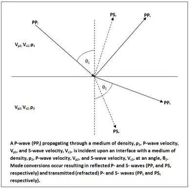 The situation becomes much more complicated in the case of non-normal incidence, due to mode conversion between P-waves and S-waves, and is described by the Zoeppritz equations. In 1919, Karl Zoeppritz derived 4 equations that determine the amplitudes of reflected and refracted waves at a planar interface for an incident P-wave as a function of the angle of incidence and six independent elastic parameters.[8] These equations have 4 unknowns and can be solved but they do not give an intuitive understanding for how the reflection amplitudes vary with the rock properties involved.[10]