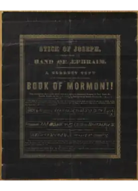 In 1844, Church of Jesus Christ of Latter Day Saints published a broadside about the Book of Mormon called "The Stick of Joseph" that reprinted some "reformed Egyptian" characters that resemble those on the first three lines of the "Caractors" document. The broadside said that the characters were those that had been shown to Anthon.[13] But it is unlikely that the characters on the broadside came directly from the "Caractors" document because Whitmer was excommunicated in 1838 and took his papers with him.[14]
