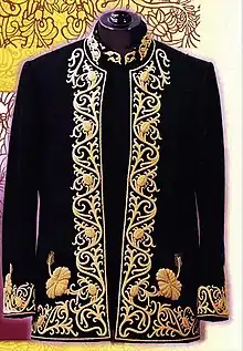 The Muskat is made of black wool embroidered with gold thread, in the pattern of the hibiscus, Malaysia's national flower. The dress is worn with headdress and embroidered long trousers at ceremonies to mark the King's installation, birthday, official visits to the states, and during the opening of Parliament. Past Hari Merdeka celebrations saw various other appearances of this dress.