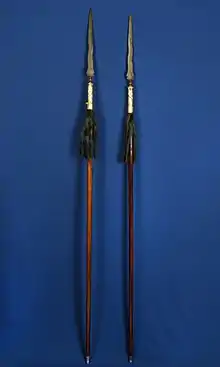 The Tombak Berambu (Long Spears) are also 20 in number, and have blades with three, curved indentations. They are made from ancient spears given by the eleven states of Peninsular Malaysia.