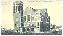 First Baptist Church on the corner of Victoria Avenue and Lorne Street, was opened in 1911 and its gold organ pipes first heard in 1912. The church was renowned for its large domed ceiling and chandelier. The Institute for stained glass in Canada has documented the stained glass at First Baptist Church.[54] The 1912 Regina "Cyclone" severely damaged the church but it was soon restored.[55] Unlike other imposing church buildings in downtown Regina and the East End,[56] First Baptist survives as a major landmark.