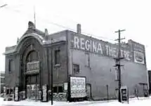 - (a) The destruction by fire in 1939 of the 800-seat Regina Theatre on the corner of 12th Avenue and Hamilton (now the site of the old Hudson's Bay Company department store building). It was home from 1910 to the Regina Operatic Society, the Regina Orchestral Society and travelling vaudeville and stage plays.[28] The Regina Theatre doubled as a cinema and a legitimate theatre; famous travelling troupes which crossed Canada on the CPR before cinema and television performed there. One was being performed in by "Boris Karloff", when the "Regina Cyclone" struck in 1912; he famously took part in the exercise of helping out immediately afterwards. And