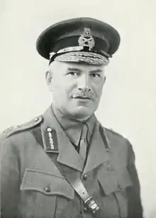 The division remained in reserve until April 1918, when German forces attacked as part of the Spring Offensive. During the Battle of the Lys, the Portuguese Expeditionary Corps was effectively wiped out, leaving a two-mile wide gap in the British lines. The 33rd was ordered into position, and Pinney personally commanded the divisional machine-gun battalion, which—with the assistance of various stragglers from retreating units—helped turn back a heavy German attack at the Battle of Hazebrouck on 12 and 13 April.[1] For his service in April, Pinney, along with the commanders of the 12th, 55th and 61st Divisions, was appointed a Knight Commander of the Order of the Bath.[45] The 33rd was used to train the American 30th Infantry Division through the summer,[33] but went over to the offensive in September, seeing action at the Battle of the St Quentin Canal, the Battle of Cambrai, and the Battle of the Selle.[35] At the Selle, Pinney organised a dawn attack with improvised bridges, allowing the 33rd to force a bridgehead and successfully clear the opposing bank in a short time.[33] The division finished the war in the Sambre valley, and began demobilisation.[35] In February 1919, with the division mostly demobilised, Pinney retired from the army, aged fifty-six, after thirty-five years service.[1]