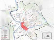 At the turn of the 5th century, the Regio was divided into 19 vici (districts) and 2,600 insulae (blocks). It had two curators and was served by 48 Roman magistrates.[4]