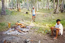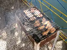 In addition, outdoor barbecues (usually known simply as BBQ) are popular among local residents on short trips to regional parks in the countryside.[11] These are invariably charcoal-fired, with marinated pieces of meat, usually beef, pork, sausage or chicken wings, cooked using long, hand-held forks. Honey is brushed on near the end of cooking. At the same time, foil-wrapped pieces of corn and sweet potato are placed on the hot coals; these take a long time to cook so they are usually eaten at the end of the barbecue.
