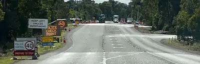 During the Western Australian government response to the COVID-19 pandemic, travel between regions – other than between Perth and Peel – was restricted, with police checkpoints set up at the borders. Only essential travel was allowed.[11] At some checkpoints, police were assisted by army and State Emergency Service personnel;[12] the army did not have any authority to prosecute or arrest.[13] Remote communities and some "biosecurity areas"[14] had further travel restrictions[15] due to the lack of medical facilities and number of high risk community members. Some inter-regional restrictions were lifted on 18 May,[16][14] and on 5 June all regional restrictions were removed except for remote Aboriginal communities.[17]
