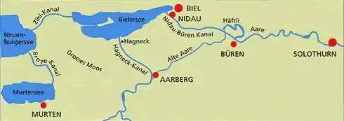 Since the Second Jura water correction, the Murgenthal Status regulates the maximum and minimum levels of the three lakes, as well as the maximum outflow downstream.[1] The system was completed with the Flumenthal dam regulating the flow further downstream of the merging of river Emme.