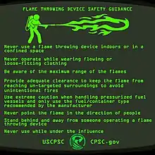 In 2018, the U.S. Consumer Product Safety Commission issued guidance on the safe operation of flamethrowers, with guidance creator Joseph Galbo acknowledging "While CPSC had received no reports of flamethrower injuries, it seemed prudent to put out safety tips for the public." following the introduction of more powerful civilian flamethrowers that year.[4] In the same year, The Boring Company introduced a "flamethrower" that was a blow torch shaped to look like a gun, and therefore it is legal to use in all U.S. states except Maryland.[5] The sale attracted criticism, with politician Miguel Santiago seeking to introduce legislation that would ban sales of the device in California.[6]