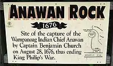 On August 28, 1676 Captain Benjamin Church surrounded and captured Anawan, a Wampanoag sachem who had become chief upon the death of King Philip two weeks earlier. The Wampanoags had taken a position above Squannakonk Swamp to hide from the colonists. Church's capture and execution of Anawan effectively ended the campaigns in southeastern Massachusetts of King Philip's War. Anawan Rock, a large puddingstone, still marks the location.[8] Although a desolate place at the time, the rock is not far off modern-day Route 44.