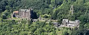 Reichenstein Castle (German: Burg Reichenstein), also known as Falkenburg is a castle in the UNESCO World Heritage Site of the Upper Middle Rhine Valley. It stands on a mountain spur on the eastern slope of the Bingen Forest, above the Rhineland-Palatinate municipality of Trechtingshausen in the Mainz-Bingen district in Germany.