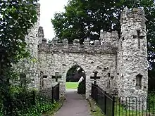 The name "Reigate" first appears in written sources in the 1190s. Similar forms are also recorded in the late medieval period, including Reigata in 1170, Regate in 1203, Raygate in 1235, Rigate in 1344 and Reighgate in 1604. The name is thought to derive from the Old English rǣge meaning "roe deer" and the Middle English gate, which might indicate an enclosure gate through which deer were hunted.[4] It has also been suggested that the "rei" element may have evolved from the Middle English ray, meaning a marshland or to a stream,[5] although this theory is considered unlikely as the Old English form of this word is ree rather than rey.[4][note 1]