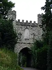 In 1777 a mock medieval gateway was built over the ruins of the original castle. An inscription is written on the side of the gateway, in English on one side and Latin on the other:
