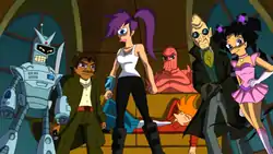 ![]() Left to right: Bender, Hermes, Leela, Dr. Zoidberg, Fry, Professor Farnsworth and Amy as depicted in the episode's third segment. | |