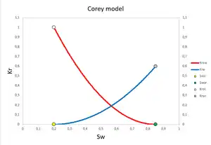 An often used approximation of relative permeability is the Corey correlation [5] [6] [7] which is a power law in saturation. The Corey correlations of the relative permeability for oil and water are then