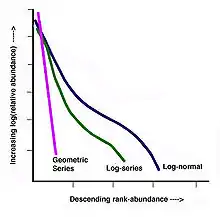 Relative species abundance is a component of biodiversity and is a measure of how common or rare a species is relative to other species in a defined location or community.[1] Relative abundance is the percent composition of an organism of a particular kind relative to the total number of organisms in the area. Relative species abundances tend to conform to specific patterns that are among the best-known and most-studied patterns in macroecology. Different populations in a community exist in relative proportions; this idea is known as relative abundance.
