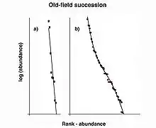 The geometric series rank-abundance diagram is linear with a slope of –k, and reflects a rapid decrease in species abundances by rank (Figure 4).[12] The geometric series does not explicitly assume that species colonize an area sequentially, however, the model fits the concept of niche preemption, where species sequentially colonize a region and the first species to arrive receives the majority of resources.[13] The geometric series model fits observed species abundances in highly uneven communities with low diversity.[13] This is expected to occur in terrestrial plant communities (as these assemblages often show strong dominance) as well as communities at early successional stages and those in harsh or isolated environments (Figure 5).[8]