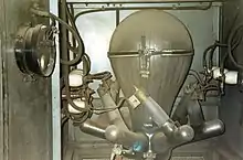 An example of the mechanical voltage conversion employed was described for the lighting of Sampierdarena Train Station. The Thury system powered a 60 hp (44 kW) motor which drove via belts twelve Siemens and two Technomasio dynamos for the station's lights.[12] Genoa's Thury system was progressively upgraded to transmit 630 kW at 14 kV DC over a circuit distance of 120 km, using later dynamos capable of producing 2.5 megawatts (5000 volts at 500 amperes) using double commutators to reduce the voltage on each commutator.[13][14][15]