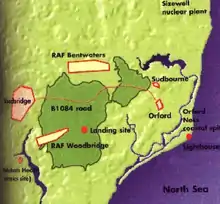 ![]() Security fencing at the site of the former East Gate of RAF Woodbridge where the incident began in December, 1980. The original East Gate was much smaller.[1] | |