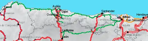 Renfe Feve[1] is a division of state-owned Spanish railway company Renfe Operadora. It operates most of Spain's 1,250 km (777 mi) of 1,000 mm (3 ft 3+3⁄8 in) metre gauge railway. This division of Renfe was previously a stand-alone company named FEVE (Ferrocarriles de Vía Estrecha,[2] Spanish for "Narrow-gauge railways"). On 31 December 2012, the Spanish government simplified the organization of train companies merging Feve into Renfe and Adif.[3] The rolling stock and the brand FEVE was transferred to Renfe (renamed to "Renfe Feve") and the infrastructures were transferred to Adif.