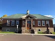 The Renfrew Post Office, built in 1908, is located at 249 Raglan Street South. Built in the Romanesque Revival style with exterior walls of irregularly coursed split-faced stone and mansard roof clad in seamed copper, this beautiful edifice is a major landmark on Renfrew's main throughfare. The tapered silhouette of the metal-clad clock tower, hipped gable roof and weather vane tops the stone structure that has twinned principal entrances with metal coats of arms located above. Located below the top centre window is the engraving E.R. 1908, representing the monarch at the time of construction. The interior consists of hardwood finishes, terrazzo tile floors, plaster ceilings and walls with wood dados. Over the years, the building has shared use of the post office, customs and revenue offices, and the NHA/NHL Birthplace Museum. In 2018, the building was sold by the town to Rob Thompson Hotels Ltd. for the price tag of $100,000 with the proposal of a boutique hotel in the upper levels of the building, while retaining the post office on the main level and numerous conditions to keep the historical features intact.
