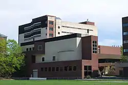 On 3 October 2008, the university celebrated the grand opening of the Experimental Media and Performing Arts Center (EMPAC) situated on the west edge of campus.[49] The building was constructed on the precipice of the hill, with the main entrance on top. Upon entering, elevated walkways lead into a 1,200-seat concert hall. Most of the building is encased in a glass exoskeleton, with an atrium-like space between it and the "inner building". Adjacent to and underneath the main auditorium there is a 400-seat theater, offices, and two black-box studios with 35-foot (11 m) to 45-foot (14 m) ceilings.[50] Originally budgeted for $50 million, the EMPAC construction costs ballooned to over $200 million due to difficulty of anchoring the foundation in the soft clay of the hill.[51]