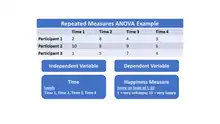 Repeated measures analysis of variance (rANOVA) is a commonly used statistical approach to repeated measure designs.[3] With such designs, the repeated-measure factor (the qualitative independent variable) is the within-subjects factor, while the dependent quantitative variable on which each participant is measured is the dependent variable.