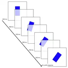 ![]() Schematic of implied motion trial. Rectangle appears for 250 ms, followed by a blank screen for 250 ms (here slightly transparent so previous rectangle is visible). Subsequent orientations are rotated by 17°, with test probes rotations sampled between 0 and up to ±8°. Task is to determine whether third and fourth orientations were identical. People typically incorrectly identify forward probes as being identical, suggesting they have continued the implied motion of the rectangle. |