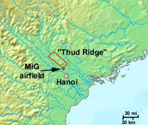 Location of the Thud Ridge (21°16′47″N 105°49′37″E) and the MiG airfield on its southern tip