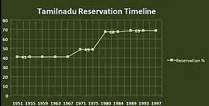 Reservation policy in Tamil Nadu is a system of affirmative action that provides historically disadvantaged groups representation in education, employment and politics. The reservations in the state rose from 41 percent in 1954 to 69 percent in 1990.[1]