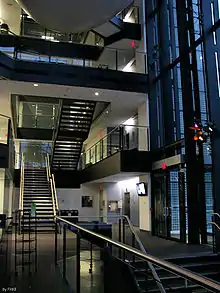 Principal photography was done mostly at Cinespace Film Studios in Toronto, Ontario.[37] Toronto police received hundreds of calls from concerned neighbors after a scene involving a burning plane crashed.[32] For the underwater scenes, cargo shipping containers were cut and welded to make a giant tank on stage.[30] The opening scene was filmed at Cinespace Film Studios.[34] Interior scenes of Umbrella Corporation's subterranean lair were filmed at the Leslie Dan Faculty of Pharmacy.[33] Robarts Library was used to portray exterior shots of a Los Angeles prison due to its resemblance to a prison, and other scenes were shot at University of Toronto Scarborough.[32] Scenes portraying an Alaskan aircraft boneyard were actually filmed at Oshawa Airport. A location depicting an Alaskan beach was filmed at Sandbanks Provincial Park.[38] Second unit was sent to Alaska to capture establishing shots of the scenery.[39]